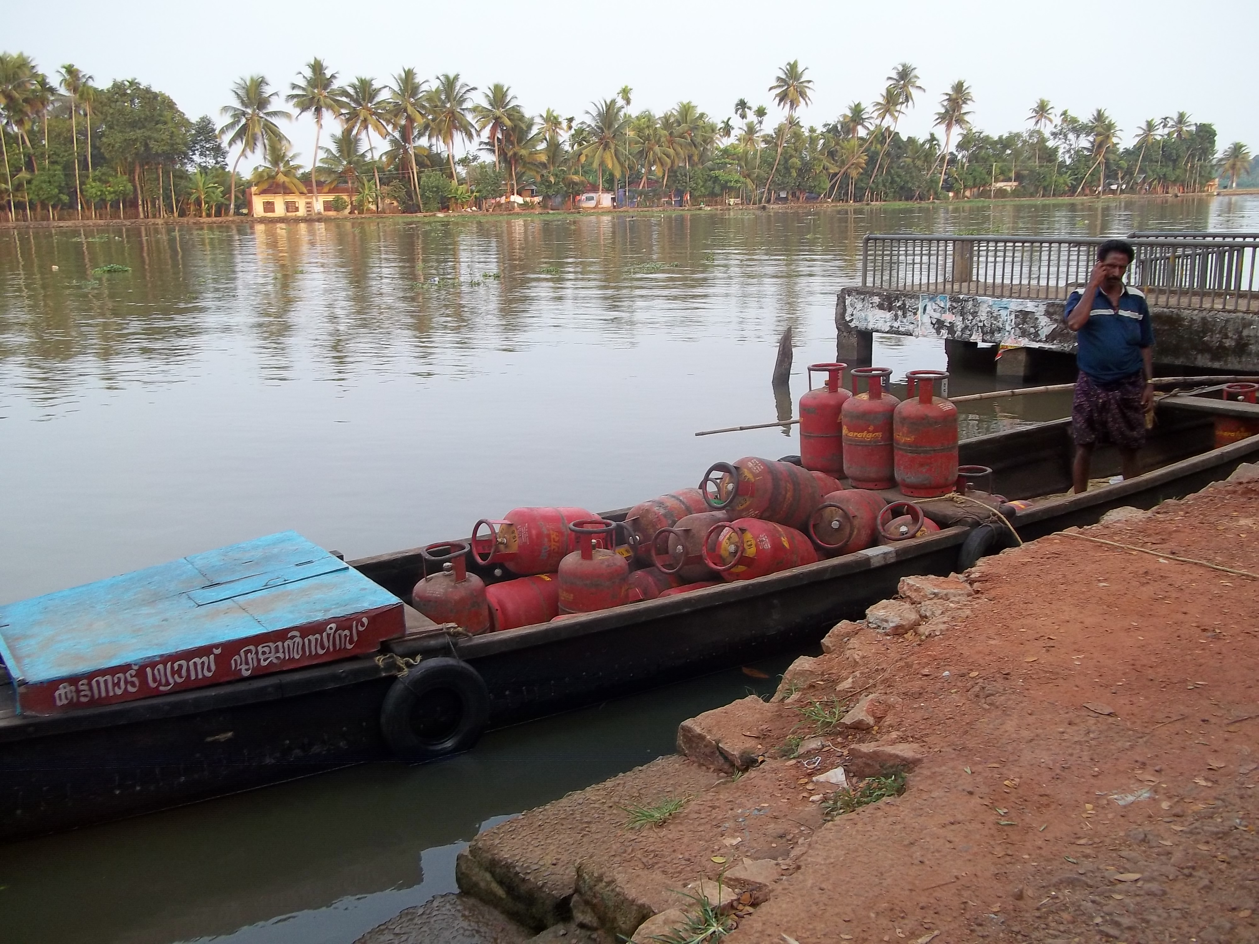 Milk, gas cylinders, vegetables all arrive by boat in villages near Kumarakom. Rivers and canals are the main thoroughfares here. Most houses face the river, not the roads. Most households catch their own fish for food. People commute mostly by boat—country boats are parked in front of nearly every house.