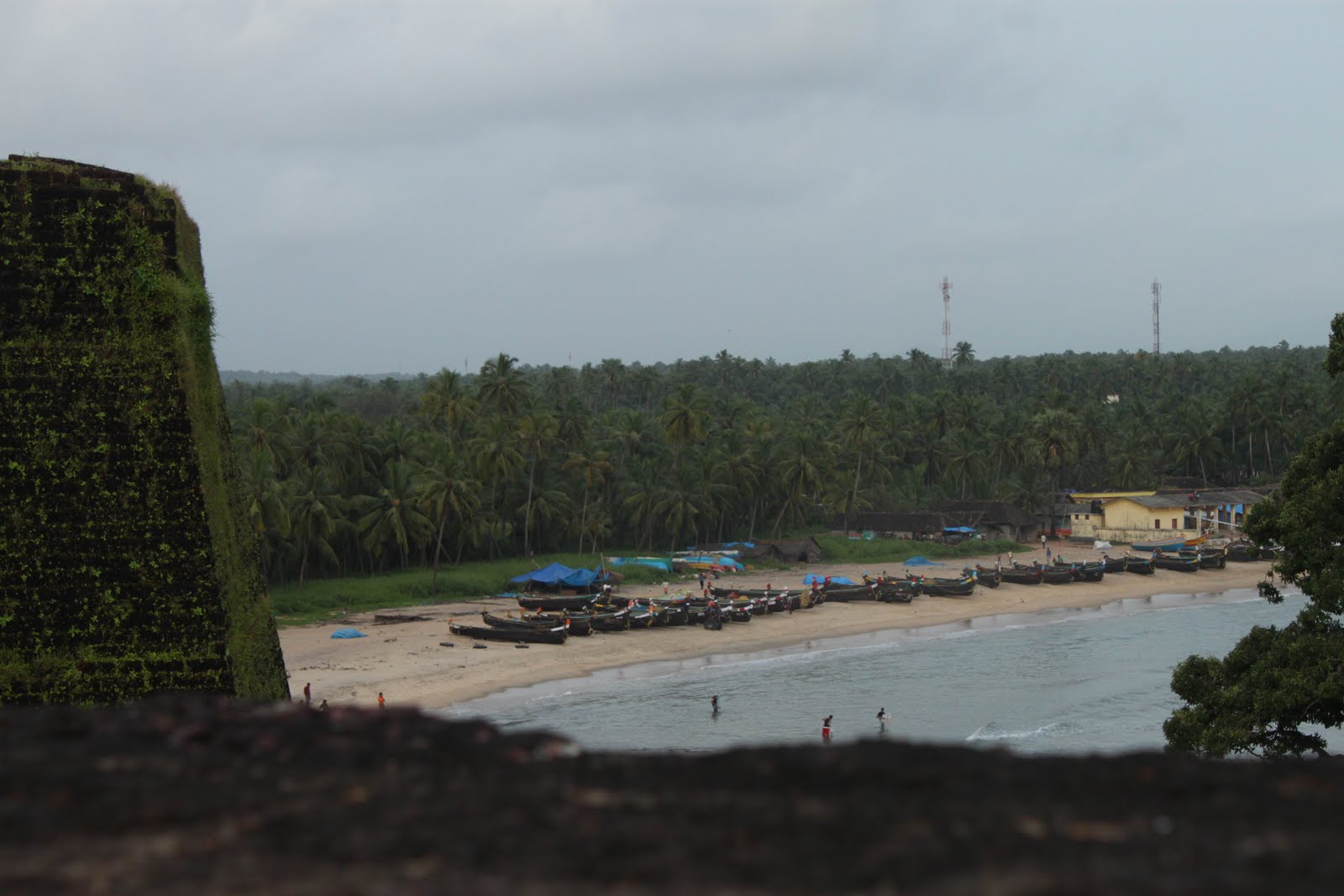 The fort thankfully is big enough for me to leave the music and the tea stall behind, as I walk along the 1.5km circumference of the fort. Walking along the moss-covered fort’s ramparts is like having a gallery-view of the entire district. Every bit of my view that’s not taken by the sea is occupied by a vast expanse of coconut trees. A row of boats lie immobile on the sand at a nearby fishing village. From the upper-circle viewpoint, I see the evening sun slowly descend upon the open, empty sea.